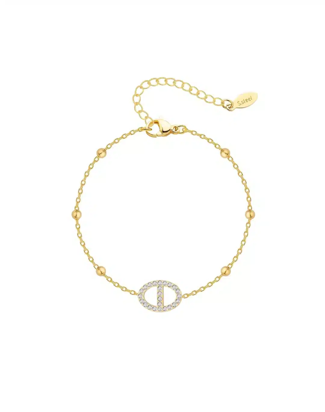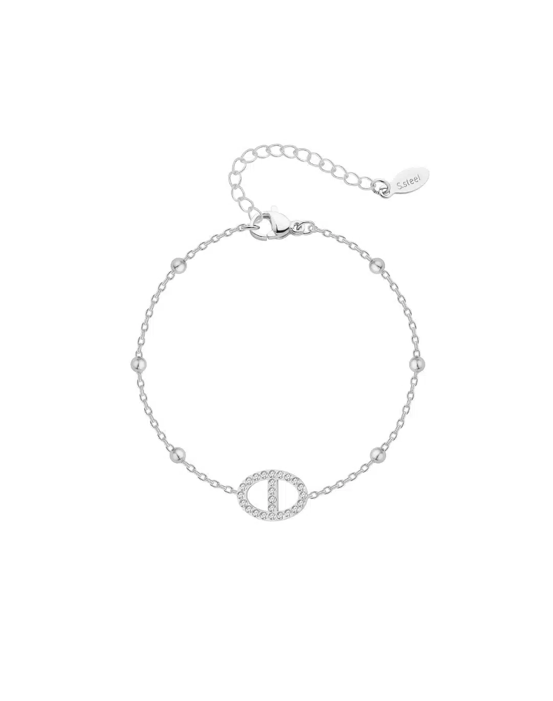 Bracelet en acier inoxydable avec pendentif Esme et des strass intégrés à l’intérieur. Disponible en doré et en argenté.
